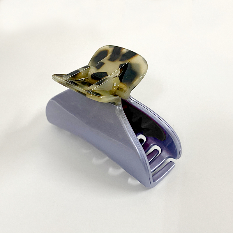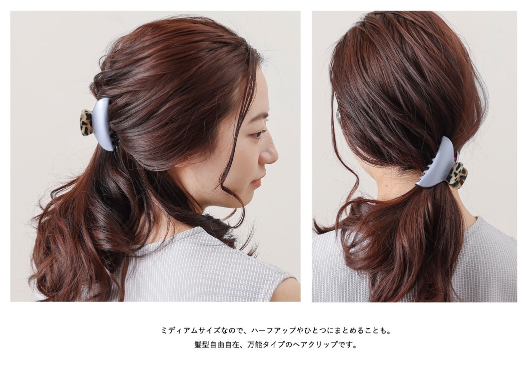 ミディアムサイズなので、ハーフアップやひとつにまとめることも。髪型自由自在、万能タイプのヘアクリップです。