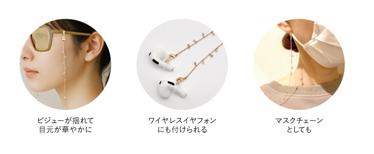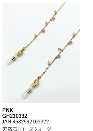 | 素材 | 本体・パーツ:合金、ニッケルフリー、天然石、ガラス、シリコン ※カラーごとに天然石が異なります。 PNK:ローズクォーツ(天然石) BLU:アクアマリン(天然石) |